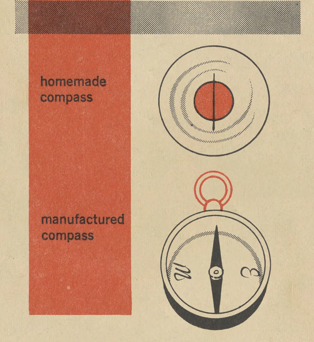 If you have a globe that is round like a ball, you may find a north and south pole marked on it. These poles are the geographic North and South Poles. The magnetic poles of the earth are near these Poles. But how can you tell which end of your compass needle is pointing to the magnetic north, and which pointing to the south magnetic pole? There is more than one way to discover this. One easy way is to use a regular compass like the one pictured here. Set it down flat on the table near your homemade compass.