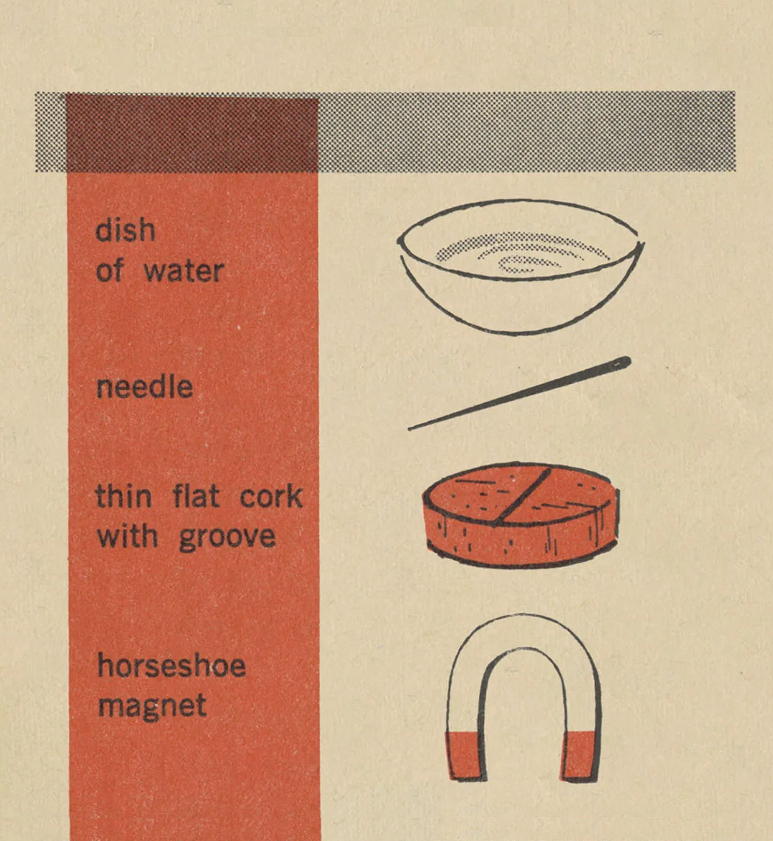 Can you think what you might do next? You want to fix the needle so that it can swing around easily, so you lay the flat piece of cork on the water in the glass dish, and then gently lay the needle into the groove in the cork so it won’t roll off. (If you can’t find a cork, pry the cork liner out of the cap of a pop bottle.) Take the magnet away so that it won’t pull the steel needle. If it does, your compass will not be accurate. Keep the cork in the middle of the dish of water so it can swing around easily. Watch it. Does it stop swinging around? Move it around and see if it stops in the same position. Try making another needle into a magnet. Put it in place of the first needle. Does it stop in the same position as the first needle you made into a magnet?