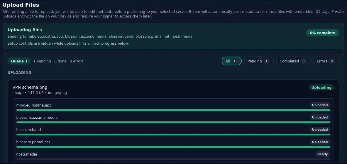 Images are synchronized across pools of multiple Blossom servers; when accessed via Nostr, the URI is queried across the entire pool.