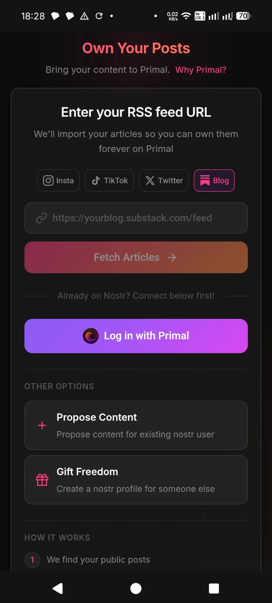 Existing posts on other blogging platforms can be seamlessly imported into Nostr via RSS, eliminating the need to recreate them. Content from Substack, Medium, Ghost, and WordPress can be synchronized fully automatically; Pareto and Primal, among others, offer solutions for this. Primal ownyourposts.com (also with Insta, TikTok and X) well done: propose Content for existing Nostr user (import on behalf) not so good: publish immediately only (without editing options)