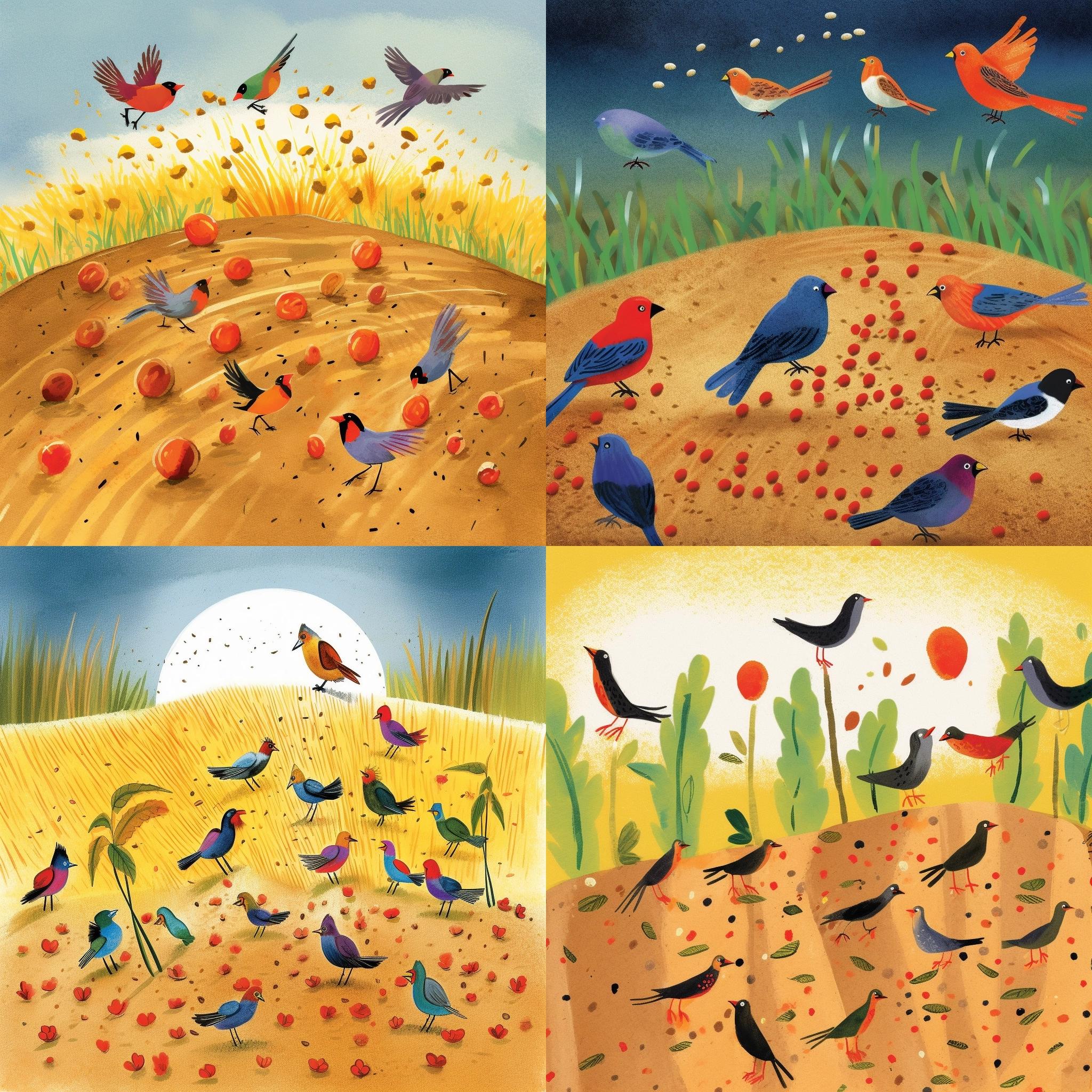 other seeds fall on the ground surrounded by birds, where they are immediately eaten by hungry birds. The picture shows happy birds enjoying the seeds before they even have a chance to grow. Illustration by Eric Carle --q 2 --v 5