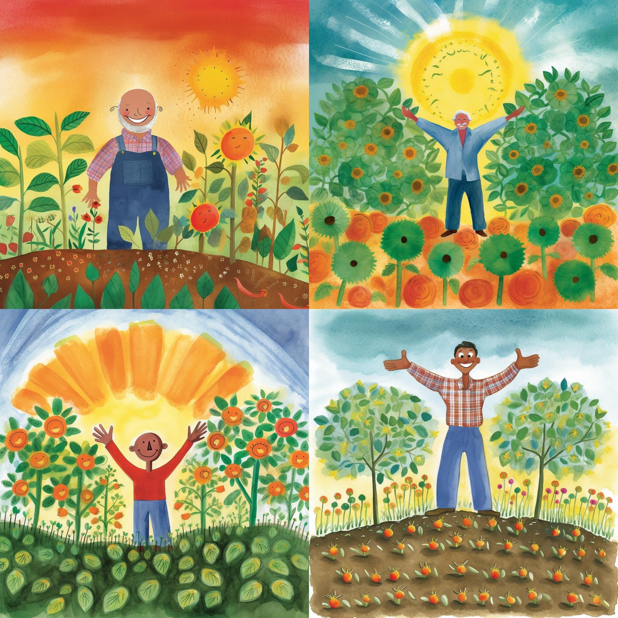 Finally, some seeds fall on the fertile soil, where they can root deeply and grow. The picture shows large, healthy plants thriving in the sun and bearing abundant fruit. The farmer stands proudly next to the rich harvest and smiles, knowing that he has sown well. Illustration by Eric Carle --q 2 --v 5