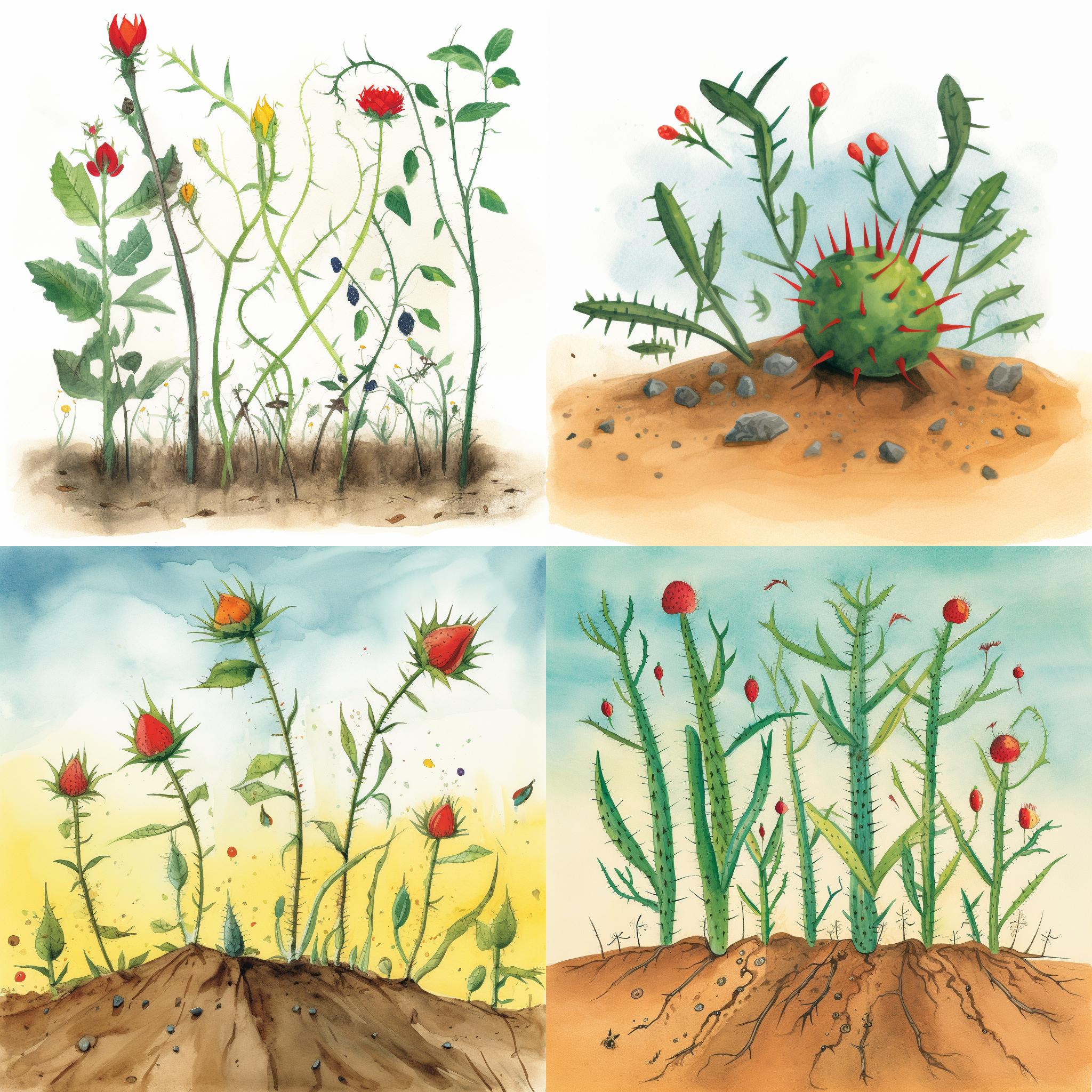 Bild 3: Andere Samen fallen auf den dornigen Boden, wo sie von Dornen und Unkraut umgeben sind. Die Pflanzen beginnen zu wachsen, aber sie werden von den Dornen erstickt, die sie umgeben. Das Bild zeigt, wie die Dornen die jungen Pflanzen umklammern und sie daran hindern, groß und stark zu werden.