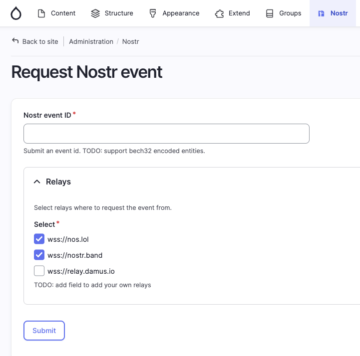 This module renders Nostr events that are saved in the Drupal database. In the admin area, I also added a route that loads a form where you can copy-paste an event ID, fetch the event, and save it as a Nostr event entity.