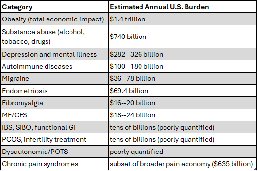 The organism described in this framework has documented access to the signaling systems that drive the conditions consuming the majority of that spending. The aggregate annual U.S. cost of conditions plausibly linked to organism activity — depression, autoimmune disease, migraine, endometriosis, fibromyalgia, chronic fatigue, obesity, addiction, metabolic syndrome, dysautonomia, chronic pain, and the functional gastrointestinal disorders — exceeds $2 trillion when obesity ($1.4 trillion in total economic impact) and substance abuse ($740 billion) are included alongside the figures enumerated in Section A.