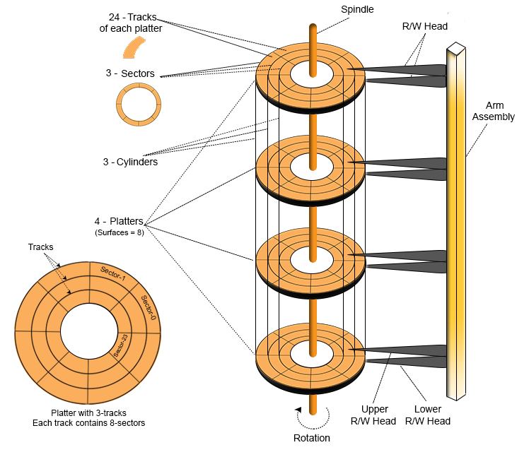 ให้ดูตรงรูปกลม ๆ ทางซ้ายมือจะเห็นได้ว่ามันเป็นหน่วยความจำในจานหมุน ซึ่ง sector คือหน่วยย่อยสุด และ sector รวม ๆ กันหลาย ๆ sector จะเป็น cluter บางที่ก็เรียก Tracks บางที่ก็ Block ซึ่งนี่แหละคือบล๊อกที่ผมหมายถึง